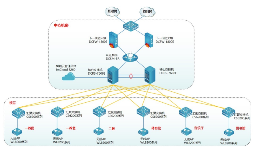 为方便用户对无线管理和维护,提升用户无线体验,使无线更智能化,此次采用银河集团官网智能云管理平台ImCloud 8260实现无线统一的管理、维护、认证,并可实现对全网无线设备管理、实现易部署、易维护、易扩展的无线网络。银河集团官网云管理ImCloud方案是网络服务的新模式,基于云端实现网络服务和管理,将复杂的网络管理简单化、智能化、可视化,提升用户网络体验。同时为了保证无线的安全,无线采用Portal准入认证,云管理ImCloud和银河集团官网身份认证系统DCSM-BR实现联动,用户需要顺利获得账号和密码认证成功后才能接入无线网络,在保证无线连接的便捷性同时兼顾无线的安全性。