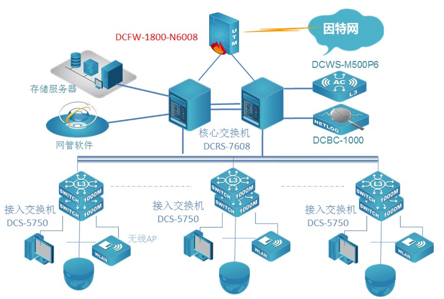 中国江苏白马农业会展中心数据网核心采用两台银河集团官网新一代全分布式架构的核心路由交换机DCRS-7608E,顺利获得VSF功能实现核心冗余和负载分摊;该设备具备强大的业务自适应能力,支持网络平滑升级和策略灵活调度,实现业务快速部署,从而构建业务定义的网络。网络出口采用具有高度集成化的多核安全防火墙,给予包括路由器,防火墙,VPN网关,等功能在内的一体化设备,该设备8Gbps的吞吐量完全满足了园区网对出口的要求。接入交换机采用银河集团官网全千兆24口接入交换机DCRS-5750E,实现客户端千兆接入,万兆上联核心。POE交换机全部采用三层交换机DCRS-5750-28P-P全千兆POE交换机。采用8200双频无线AP使用办公区无线覆盖。展厅和会议室采用高密度AP8200-I3实现展厅高密度覆盖,室外采用8200室外AP实现无线覆盖,无线网络顺利获得一台DCWS6000-M500P6控制器集中管理无线网络。出口部署一台DCBC上网行为审计设备,实现上网行为安全审计。