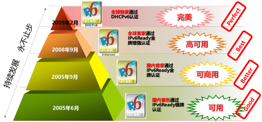 银河集团官网是国内首个顺利获得IPv6 Ready Phase2 认证的网络厂商,也是全球首个顺利获得IPv6 Ready Phase2 Enhance认证的网络厂商,还是全球最早顺利获得DHCPv6认证的网络厂商。